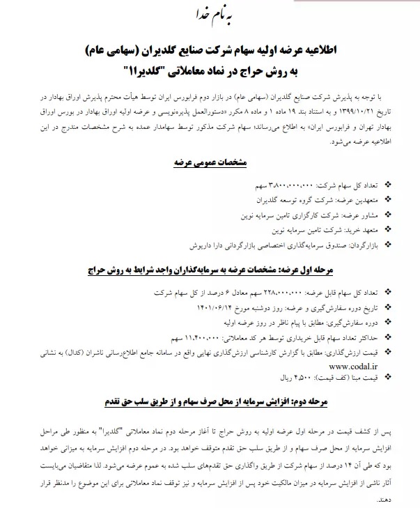 طبق اطلاعیه پس از کشف قیمت در مرحله اول عرضه اولیه به روش حراج تا آغاز مرحله دوم نماد معاملاتی «گلدیرا» به منظور طی مراحل افزایش سرمایه از محل صرف سهام و از طریق سلب حق تقدم متوقف خواهد بود.